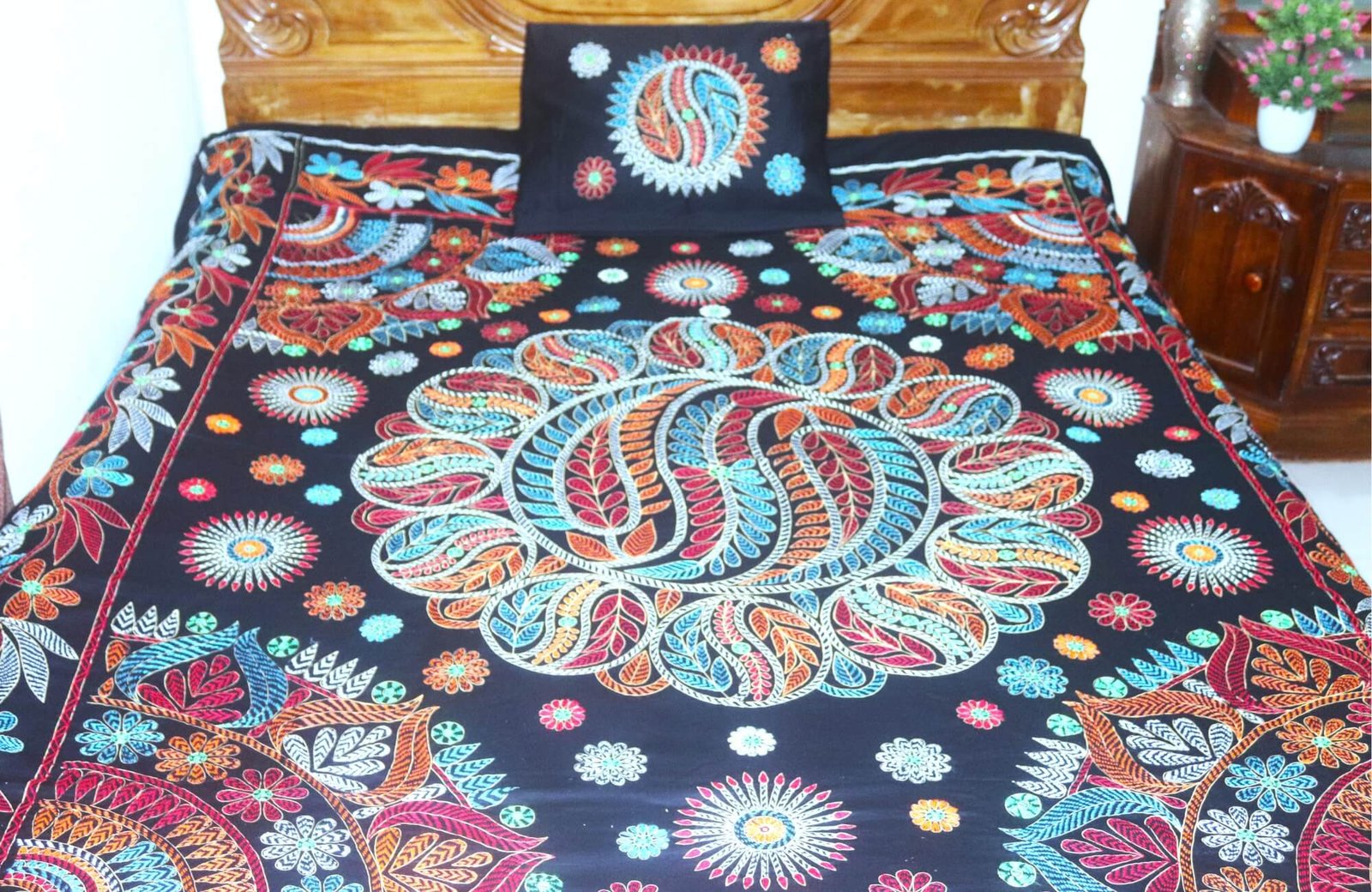 Discover the elegance of tradition with our hand-stitched Nakshi Kantha bed cover from Jamalpur. Featuring vibrant multicolour embroidery on black, this 100% cotton bed cover is perfect for adding a touch of Bangladeshi heritage to your home. Shop now at Nakshi Bazar!