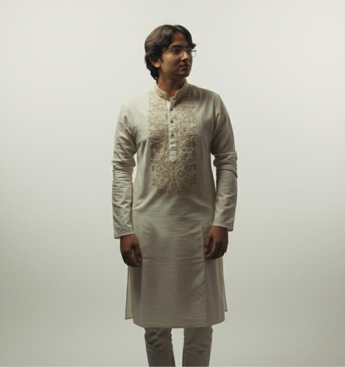 Introducing the elegant “White Color Nakshi Kantha Panjbai.” This exquisite piece of craftsmanship is a true embodiment of beauty and tradition. Handcrafted with precision and care, the intricate nakshi kantha embroidery captures the essence of Bengali culture. The white colour adds a touch of purity and elegance to this stunning Panjabi.