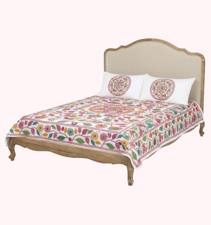 Enhance your bedroom decor with the White Nakshi Kantha Bed Cover with Pillow Cover set from Nakshi Bazar. Experience the beauty of handcrafted luxury and cultural heritage in every stitch.